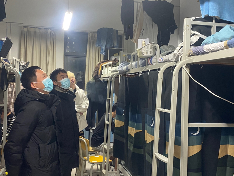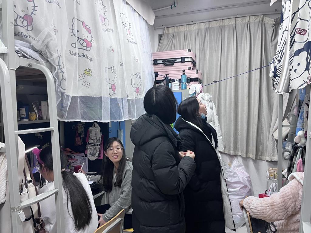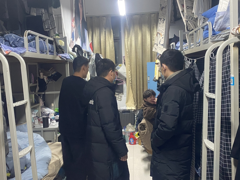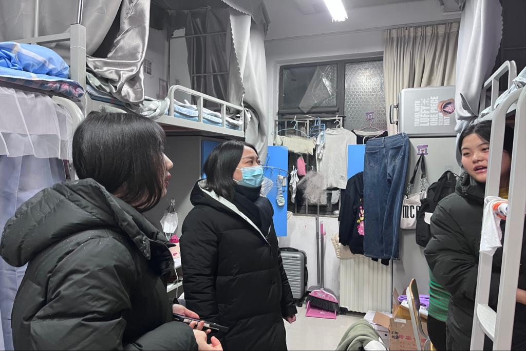 冬阳送暖入寝间,关怀备至查宿安。为营造良好的学习生活环境,加强宿舍安全管理,了解员工在校情况和思想动态。12月14日晚,幼儿教育公司党支部书记、经理李海英,党支部副书记丁鼎,辅导员冯凡,陈艾嘉,不畏严寒,带着温暖和关怀,走访了员工宿舍。