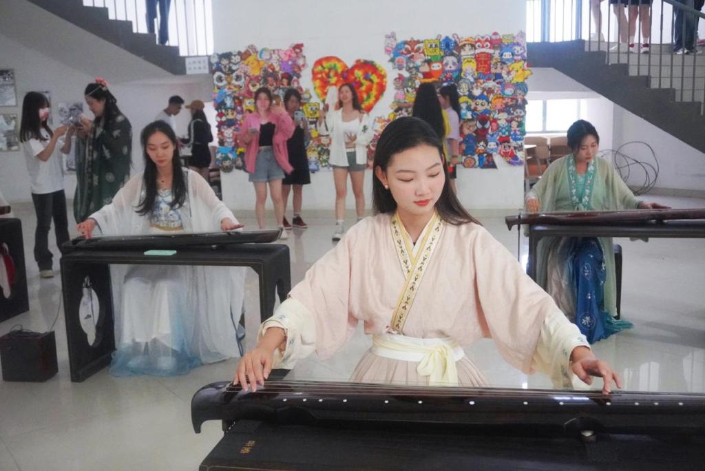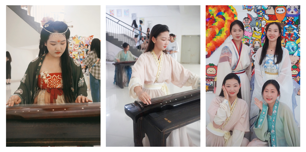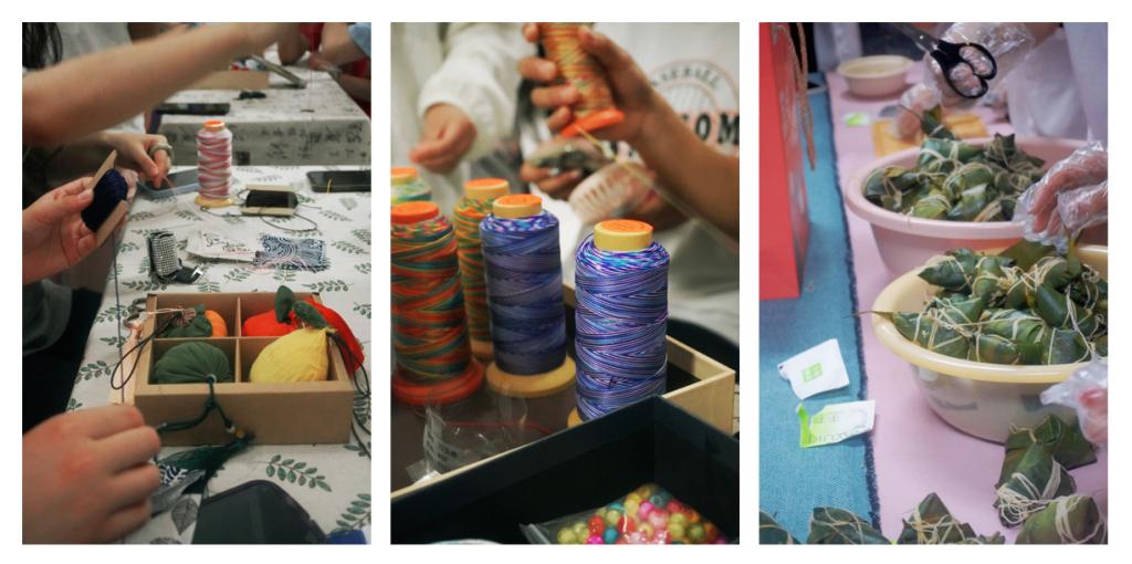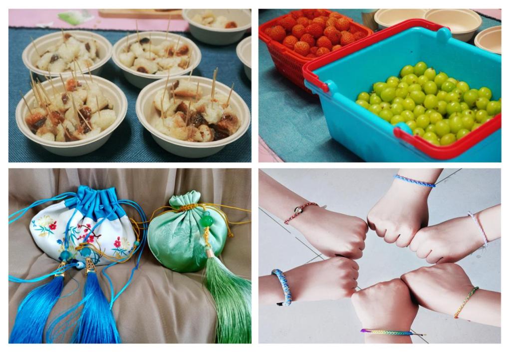 此次活动共分为三个区域,第一个是古琴体验区,在这个区域,不仅可以看到身着汉服的同学为大家弹奏优美动听的曲子,还可以亲自抚琴体验中国传统乐器的韵味;第二个是手工体验区,在这里为同学们准备了各色的丝绳、布料、香料等,可以亲自动手制作端午香囊和五彩手绳,还有身着传统服饰的同学为大家指导;第三个是品尝区,在这里,可以品尝清香的粽子、香甜的水果和各种茶水。为了让员工们能充分体验端午节的传统习俗,感受棱角里历史的传承之美,软糯间森林的清香之味,在20日上午,必一运动李海英经理带领22级的同学一起亲自动手包粽子,这些同学都是第一次包粽子,在李经理的耐心指导下,大家从手忙脚乱逐渐变得动作娴熟,包出来的粽子也从奇形怪状变得有模有样了。活动一开始,整个大厅就瞬间沸腾了,同学们穿梭于各个区域,体验各种活动。