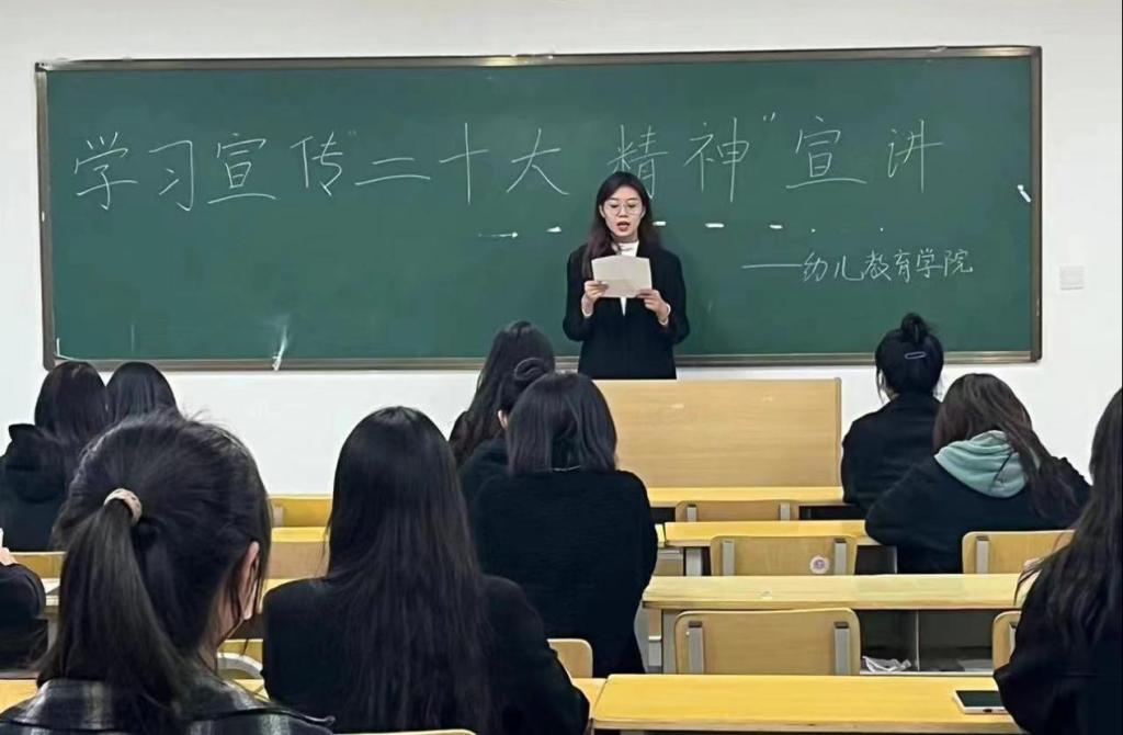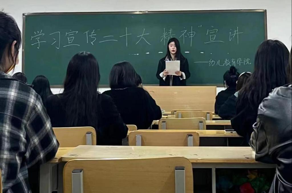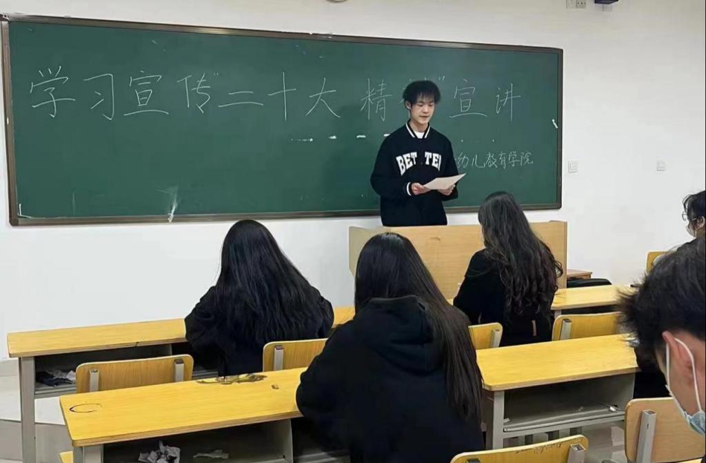 宣讲团成员候伟鹏讲道,作为必一运动的员工,我们应当立壮志,树新风,切实把思想和行动统一到党的二十大精神上来,在全面建设社会主义现代化国家、全面推进中华民族伟大复兴的新征程中贡献青春力量!成员申敬洋谈到青年应当树立远大的理想和抱负,将实现个人价值的目标与时代奋进的目标结合起来,在不懈奋斗中实现人生价值。成员杨果在宣讲中谈到,在近期疫情波动时期,每天看着在操场上辛苦为我们进行核酸检测的年轻的医护人员,更加感受到青年一代正在逐渐扛起时代赋予的使命。作为幼教学子,也应无愧使命担当,牢记嘱托、乘势而上,为祖国第二个百年奋斗目标奉献自己的力量。