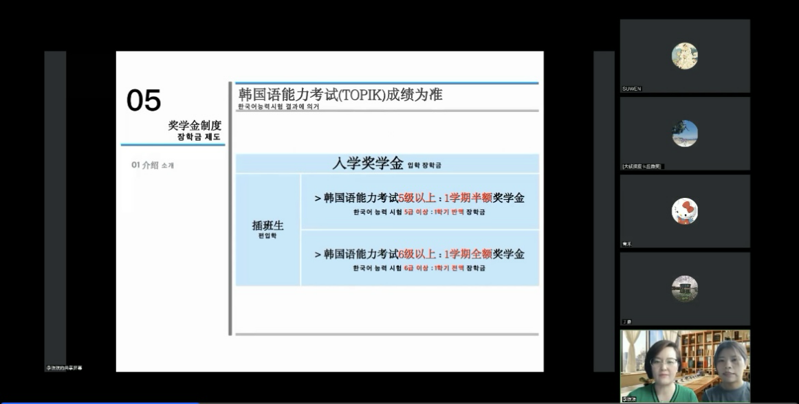 韩国仁荷大学儿童心理学科金彗羅教授针对韩国仁荷大学的教学模式、公司宿舍,休息场所、学费、奖学金等方面进行了讲解。仁荷大学国际教育中心中国区的李嘉玲老师,为准备赴韩求学的同学答疑解惑,向家长们介绍3+2项目信息,包括项目的课程设置、课程安排、学习环境等,帮助家长们更好地了解项目的特点和优势,使家长们更好地了解员工毕业后的就业情况和就业策略。